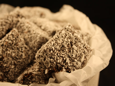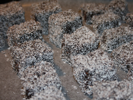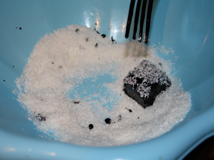 - Trecem cuburile prin glazura, le scoatem cu o furculita si le tinem sus un pic sa se scurga excesul de glazura de pe ele, apoi le aruncam in cocos si le tavalim pana sunt complet acoperite. Asezam cuburile tavalite pe o hartie de copt, la distanta unele de altele. Le lasam 2-3 ore la temp. camerei, pana glazura se usuca, apoi le punem intr-o cutie inchisa si le pastram la frigider.